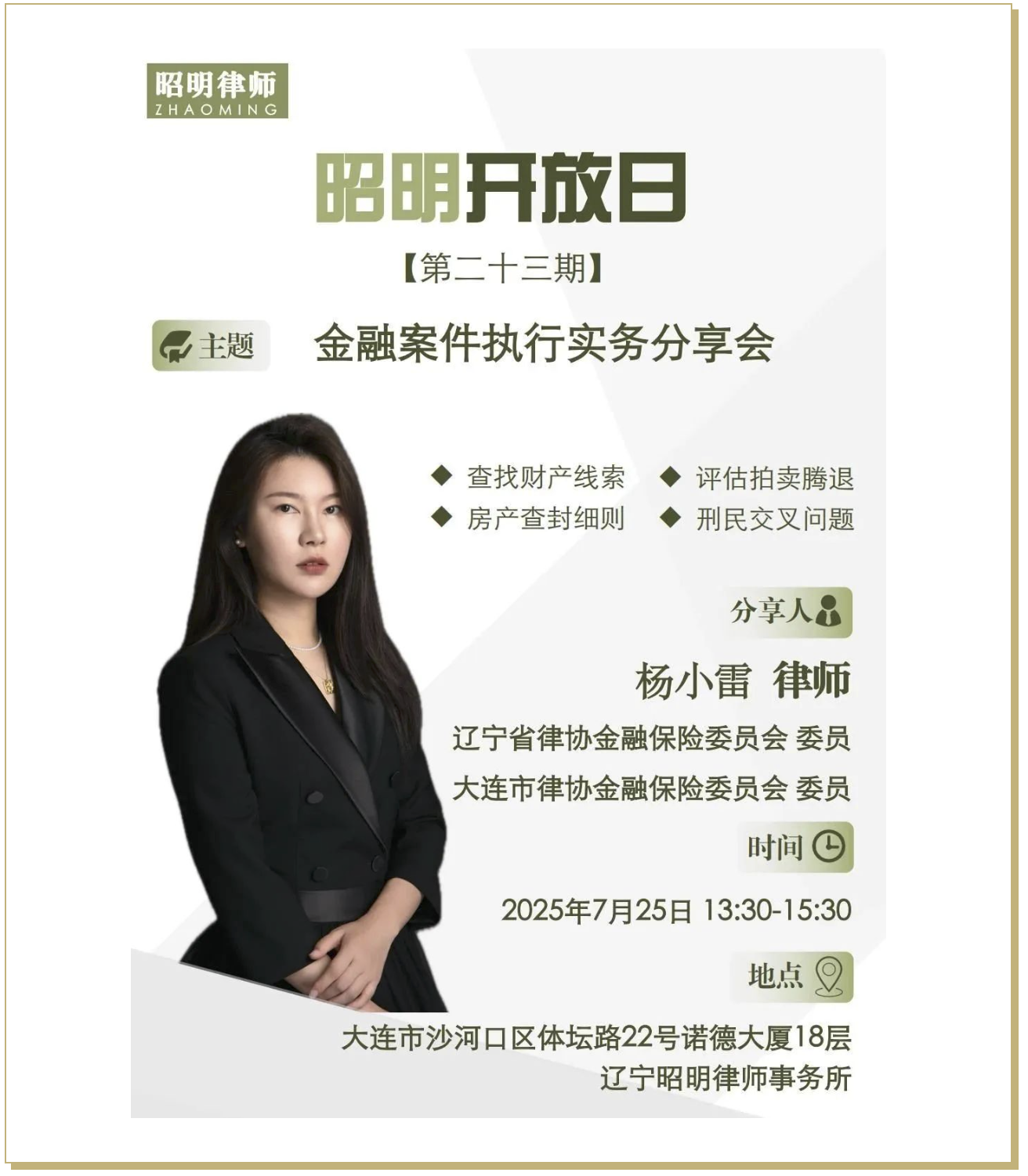 执行工作是维护司法公正的“最后一公里”。然而在司法实践中,执行工作长期受到“查人找物难”“财产变现难”“程序空转”等问题的制约。2025年7月25日的昭明开放日第23期,由辽宁昭明律师事务所资深律师杨小雷围绕金融执行案件的实务要点展开分享,从财产线索的精准挖掘到财产处置的全流程逻辑,再到房产处置的细节把控,直指执行实务中的核心难题。