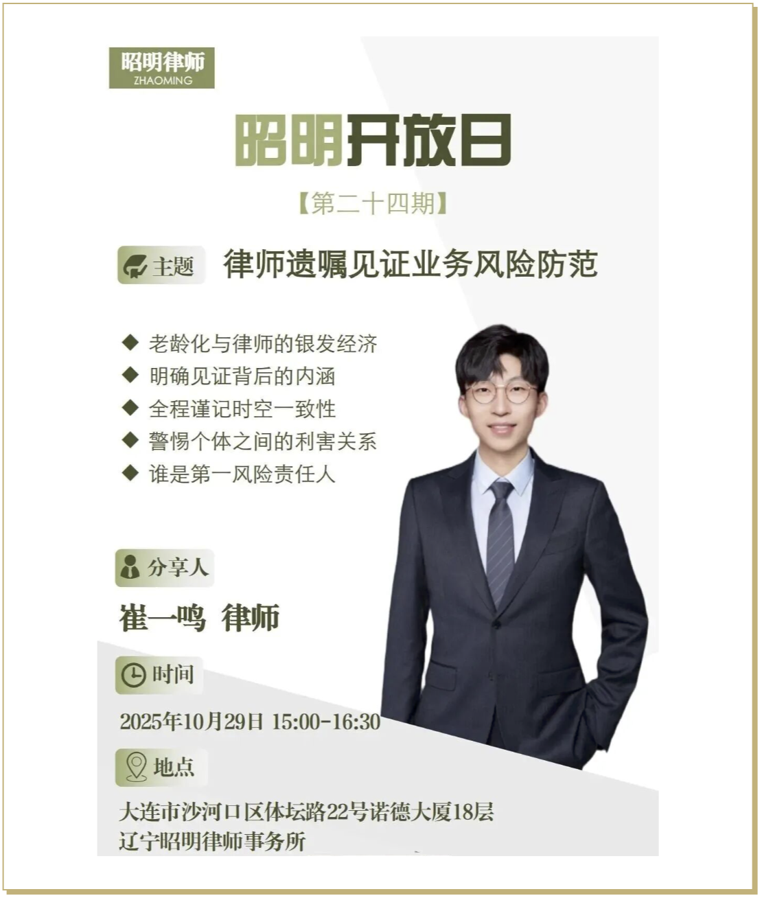 随着我国老龄化程度加深,老年人口已突破3亿大关,银发经济正成为拉动经济增长的新引擎。在这样的大背景下律师遗嘱见证业务需求激增,但其中蕴含的执业风险却不容小觑。2025年10月29日,辽宁昭明律师事务所崔一鸣律师以《律师遗嘱见证业务风险防范》为题,从多个层面剖析遗嘱见证业务,介绍对应的风险防范措施。